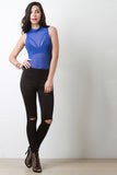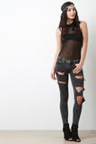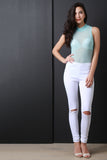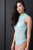 This sleeveless bodysuit features a mock neckline, semi-sheer mesh fabrication, cheeky bottom, and a double snap button closure at crotch. Accessories sold separately. Made in U.S.A. 95% Polyester, 5% Spandex.