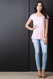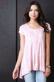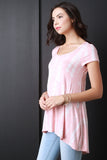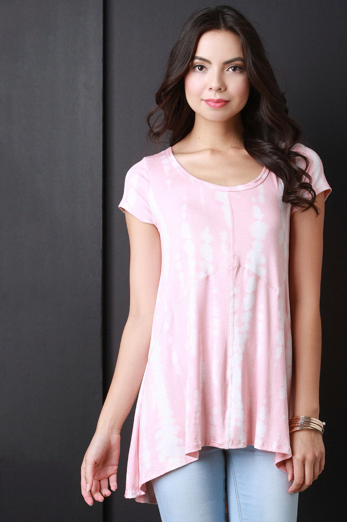 This jersey knit top features a round neckline, short sleeves, spotted tie-dye pattern design, strategically place seam, sculpturing flare fit, and a high low hemline. Accessories sold separately. Made in U.S.A. 97% Rayon, 3% Spandex.