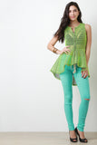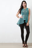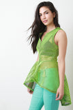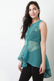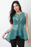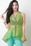 This stylish top features a fishnet mesh fabrication throughout, round neckline, and sleeveless construction. Finished with a front zip-up closure and high-low peplum cut design. Accessories sold separately. Made is U.S.A. 100% Polyester.