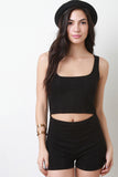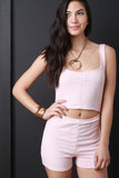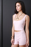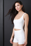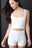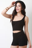 This romper features a texture ribbed knit fabrication, scoop neckline with a sleeveless design, low cut back, elasticized waist midriff opening, fully lined and shorts bottom half. Accessories sold separately. Made in U.S.A. 95% Rayon, 5% Spandex.