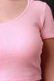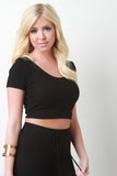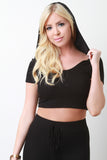 This top features a thermal knit fabrication round neck with a hoodie back, short sleeves, and a crop hemline. Accessories sold separately. Made in U.S.A. 95% Rayon, 5% Spandex.