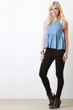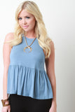 This casual top features a jersey knit fabrication, ruffled bottom design, sleeveless construction, and round neckline. Finished with a keyhole cutout open back. Accessories sold separately. Made in U.S.A. 95% Rayon, 5% Spandex.