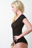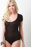This bodysuit features a soft vertical ribbed knit fabrication, round scoop neckline, short sleeves, brief bottom and double snap button closure at crotch. Accessories sold separately. Made in U.S.A. 95% Rayon, 5% Spandex.