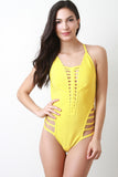 This one piece swimsuit features a thick knit bandage fabrication, braided cage center and side detail, hook closure strap at open back, and cheeky bottom. Accessories sold separately. 90% Polyester, 10% Spandex.