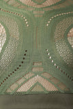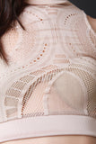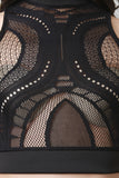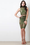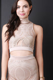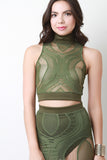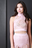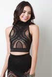 This top features an oval mesh lace pattern fabrication, mock neckline, sleeveless construction, and wide panel cropped hemline. Finished with a rear zip-up closure. Accessories sold separately. Made in U.S.A. 97% Nylon, 3% Spandex.