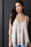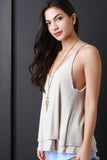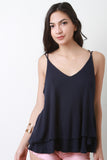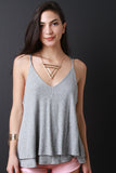 This cute sleeveless top features a textured thermal knit fabrication, v neck line, cross back spaghetti straps, double layered design, and a low cut back. Accessories sold separately. Made in U.S.A. 95% Rayon, 5% Spandex.