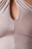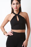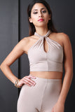 This top features a jersey knit fabrication, halter design, choker neckline, and keyhole front and back details. Finished with a double button hooks at nape and cropped hemline. Accessories sold separately. Made in U.S.A. 95% Rayon, 5% Spandex.