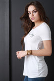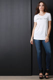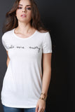 This casual top features a round neckline, "Take me away" graphic print at front, short sleeves construction, and soft jersey knit fabrication. Accessories sold separately. Made in U.S.A. 95% Rayon, 5% Spandex.