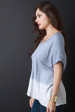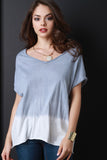 This boxy tee features a v neckline, short sleeves, knit fabrication, curved hem, ombre dip dye coloring, finished with raw hems. Accessories sold separately. Made in U.S.A. 100% Cotton.