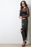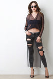 This semi-sheer mesh top features a surplice neckline, long sleeves, crop front, and a high-low hemline. Accessories sold separately. Made in U.S.A. 95% Polyester, 5% Spandex.