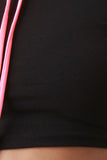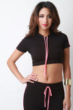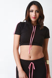 This crop top features short sleeves,contrast double stripe sewn on sleeve, contrast drawstring, hood, slim fit. Accessories sold separately. Made in U.S.A. 95% Cotton, 5% Spandex.