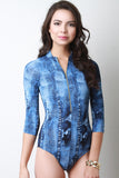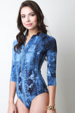 This bodysuit features a denim pattern print, half zip-up front to a flat collar neckline, quarter-length sleeves, and brief bottom. Accessories sold separately. Made in U.S.A. 96% Polyester, 4% Spandex.