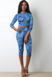 This top features denim pattern print design, mock neckline, quarter-length sleeves, and a crop hemline. Accessories sold separately. Made in U.S.A. 95% Polyester, 5% Spandex.