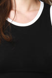This crop top features a jersey knit fabriction with contrasting trims, round neckline, and sleeveless construction. Accessories sold separately. Made in U.S.A. 48% Rayon, 48% Polyester, 4% Spandex.