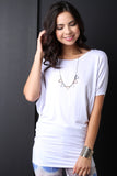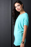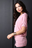 This casual top features a jersey knit fabrication, wide round neckline, and finished with a short dolman sleeves. Accessories sold separately. Made in U.S.A. 94% Rayon, 6% Spandex.