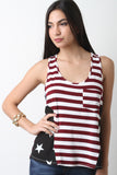 This top features a scoop neckline, sleeveless design, racerback cut, mixed print with stripe and star side insets, front pocket detail and a a high low flare hemline. Accessories sold separately. 95% Rayon, 5% Spandex.