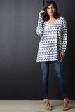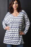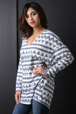 This long sleeve top features a knit fabrication, v neckline, dropped shoulder, triangle and stripe pattern, over sized fit. Accessories sold separately. Made in U.S.A. 65% Polyester, 30% Rayon, 5% Spandex.