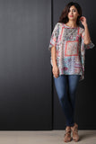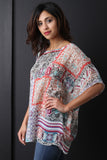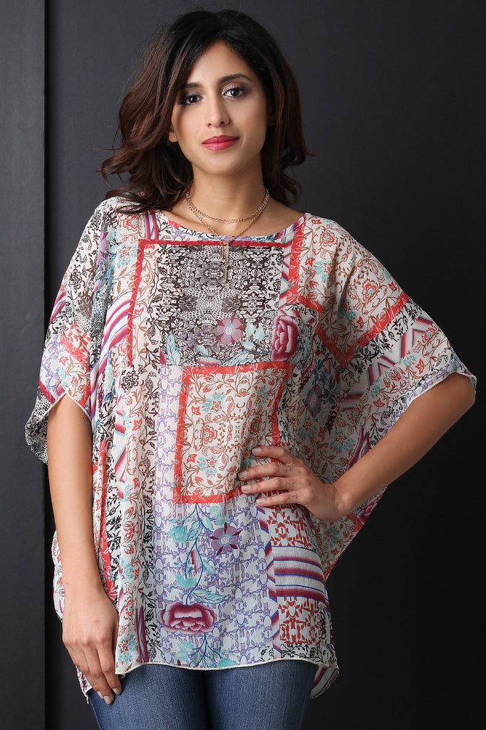 This bohemian inspired top features a chiffon fabrication, floral patchwork print, rounded neckline, dolman sleeve, and a loose boxy fit. Accessories sold separately. Made in U.S.A. 100% Polyester.