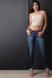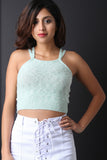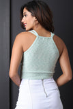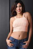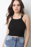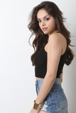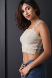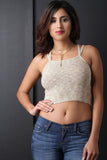 This top features a plush sweater knit fabrication, double shoulder straps, square neckline, and a ribbed knit crop hemline. Accessories sold separately. 55% Cotton, 40% Acrylic, 5% Spandex.