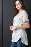 This short sleeve top features textured melange knit, v-neckline, left breast pocket, and slight high-low hem. Accessories sold separately. Made in USA. 42% Cotton, 40% Polyester, 18% Rayon.