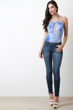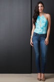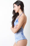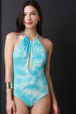 This bodysuit features a soft rib knit fabrication, tie dye coloring, halter top neckline, keyhole opening, open back, and a bikini cut bottom. Accessories sold separately. Made in U.S.A. 95% Rayon, 5% Spandex.