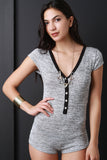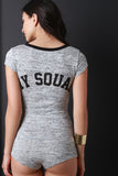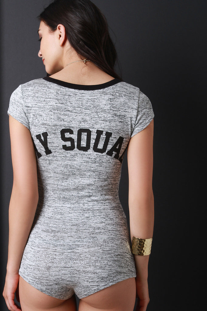 This cute romper features a v neckline, contrast trim, button up front closure, soft sweater knit fabrication, "My Squad" graphic print on back cap sleeves, and a boy short bottom. Accessories sold separately. Made in U.S.A. 80% Rayon, 17%Polyester, 3% Spandex.
