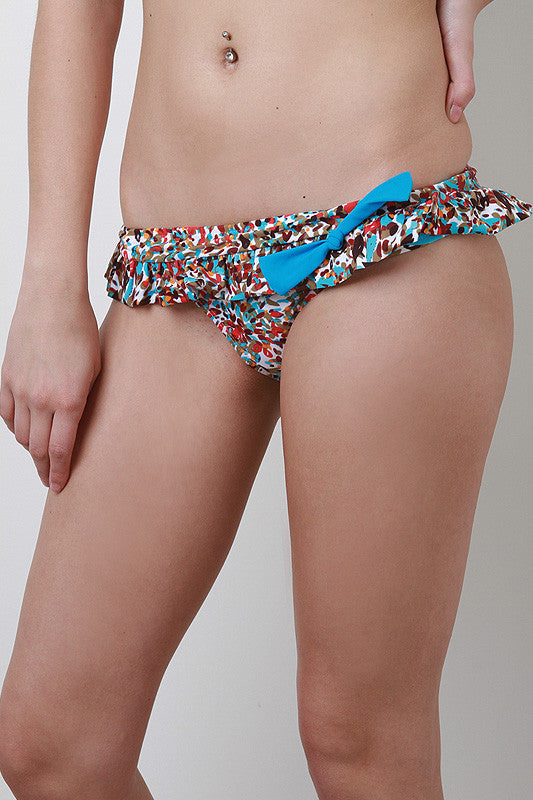 These bikini briefs feature a multicolored speckle print throughout, tiered ruffle, and contrasting bow d�cor. Fully lined. 80% Nylon, 20% Spandex. 100% Polyester Lining.