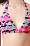 This bikini top features tribal pattern print design, wide self-tie halter and back straps, removable padded cups, and fully lined. Accessories sold separately. 80% Nylon, 20% Spandex. Lining: 100% Polyester.