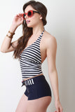 This two-piece swimwear set features striped v-neck tankini with self-tie halter, and bow accent surf short with striped trim. Finished with lining. Accessories sold separately. Shell: 80% Polyester, 20% Polyurethane. Lining: 100% Polyester.