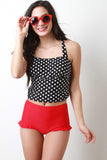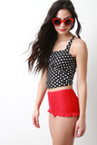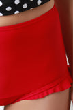 This two piece tankini swimsuit features a black and white polka dot tankini top with wide shoulder straps to a crisscross self-tie back, elasticized ruched sides, empire seam, and removable cup padding. Bottom half features a solid fabrication, high waisted, brief bottom, and side ruffle accent. Accessories sold separately. 80% Nylon, 20% Spandex. Lining: 100% Polyester.