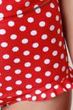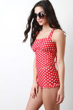This two piece tankini swimsuit features a retro inspired polka dot pattern, tankini top with wide shoulder straps to a crisscross self-tie back, elasticized ruched sides, empire seam, and removable cup padding. Bottom half features a high rise waist, brief bottom, and side ruffle accent. Accessories sold separately. 80% Nylon, 20% Spandex. Lining: 100% Polyester.