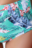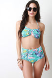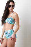 This palm leaf printed bikini set features a twisted bandeau bikini top, removable halter straps, self-tie back, removable cup padding and partially lined. Bottom features a high waisted design, strategically place vertical seam, brief bottom, and fully lined. Accessories sold separately. 80% Nylon, 20% Spandex. Lining: 100% Polyester.