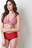 This two-piece swimwear set features striped triangle top, criss-cross back with self-tie string, and surf short bottoms with striped trim. Finished with lining. Accessories sold separately. Shell: 80% Polyester, 20% Polyurethane. Lining: 100% Polyester.