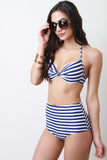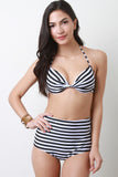 This two piece bikini set features a twisted bandeau bikini top, striped design, self-tie nape and back, and cup padding. Bottom features high waisted silhouette, striped design, and brief bottom. Accessories sold separately. 82% Polyamid, 18% Elastan. Lining: 100% Polyester.