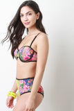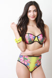 This bikini set features bandeau top with molded foam padding, removable adjustable spaghetti straps, hook and eye back, engineered tropical floral print, and contrasting black trim. Matching print bikini bottom features a high waisted construction, and fully lined. Accessory sold separately. 88% Nylon, 12% Spandex. Lining: 95% Polyester, 5% Spandex.