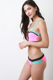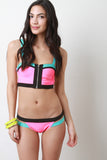 This bikini set features a top with color blocking detail, open back, non adjustable straps, hook and eye back, exposed zipper front. Bikini bottom features a low rise design, strappy sides, color blocking. Accessories sold separately. Made in U.S.A. 80% Nylon, 20% Spandex. Lining: 100% Polyester.