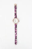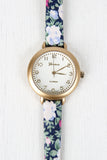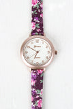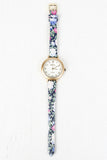 This watch features matte metallic bezel, round face with numbered hour markers, floral pattern band, and adjustable buckle closure.