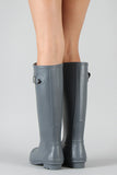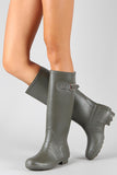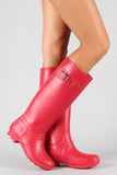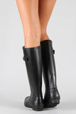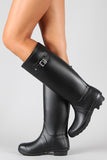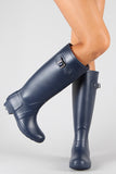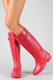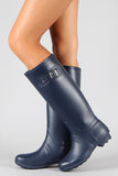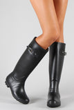 Keep your feet warm and dry in these knee high rain boots . It features round toe front, buckle decor on shaft, and low heel. Finished with cushioned insole and easy pull on style.