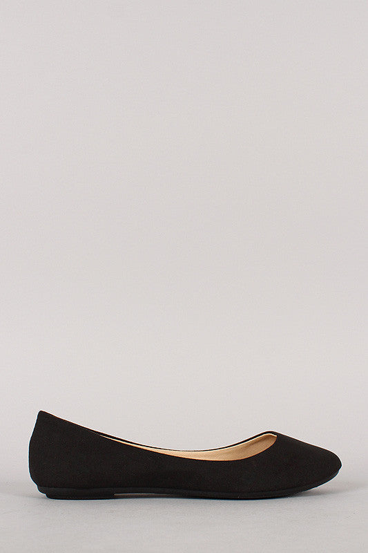 This ballet flat features a smooth faux suede upper, round toe, lightly padded insole, and easy slip on style.