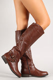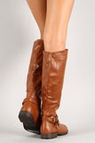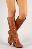 These trendy knee high boots feature a round toe, decorative buckle strap detail, and low block heel. Finished with cushioned insole, faux fur inner lining, and side zipper closure for easy on/off.