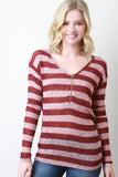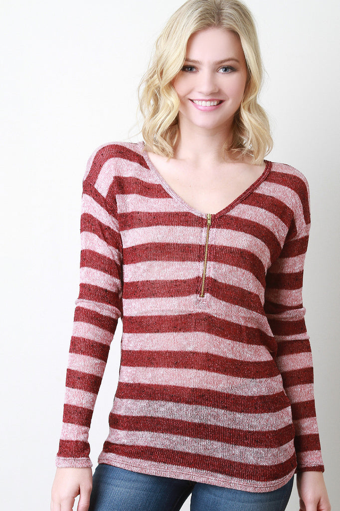 This loose knit top features horizontal stripes, v-neckline with zip-up accent, long sleeves and slight high-low hemline. Accessories sold separately. 56% Polyester, 41% Rayon, 3% Spandex.