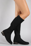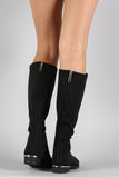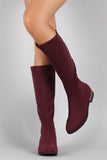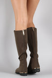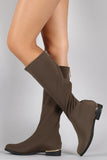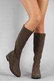 flat block heel with glossy metallic accent at the seam. Finished with a padded insole and full-length back zipper closure.