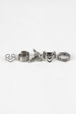 This set of five rings features a rising bird, geometric stack, chevron cutouts, and ribbed curved band designs in glossy enamel. Bands are not adjustable.