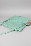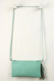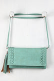 This fashionable crossbody bag features a flap design with magnetic snap closure, decorative stitched design, and a main compartment with fabric lining. The interior has a fabric lining, one zipper pocket, and two magnetic snap closure. Detachable shoulder strap with glossy metallic lobster hooks and tassel accent. Crossbody strap has a 25.5" drop.