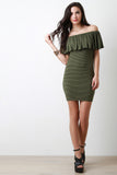 This gorgeous  stripe  knit fabrication, elasticized off the shoulder neckline with ruffle trim, and stretchy bodycon fit. Accessories sold separately. Made in U.S.A. 92% Rayon, 8% Spandex.