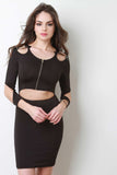 A bodycon dress featuring a zippered front, glossy metallic plate accents at the shoulders, and cutouts at the shoulders, midriff, and elbows. Finished with figure-flattering seams. Accessories sold separately. Made in USA. 95% Polyester, 5% Spandex.