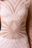 A semi-sheer mesh dress featuring a mock neck, long sleeves, and a diamond and radial design throughout. Finished with a concealed back zipper closure. Accessories sold separately. Made in U.S.A. 90% Nylon, 10% Spandex.
