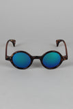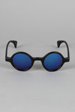 These sunglasses feature horn rim style frame, round mirrored lenses, and single nose bridge.