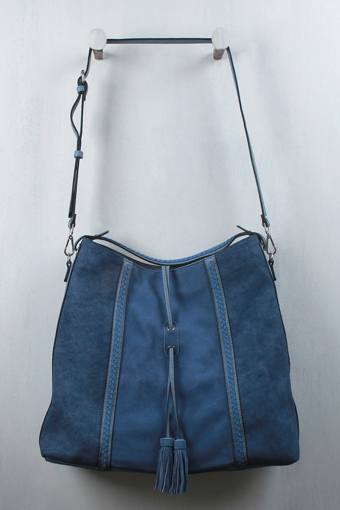 This stylish tote bag features faux suede, braided trim, tassel accents, and top zipper closure. Interior features pockets and floral lining. Bag is finished with removable adjustable shoulder strap (18" drop) and top handle (5.5" drop).