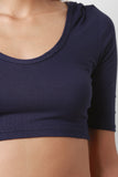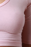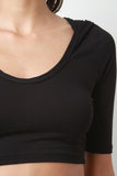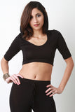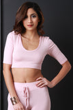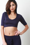 This jersey knit top features a scoop neckline with a hoodie back, short sleeves, and a crop hemline. Accessories sold separately. Made in U.S.A. 95% Rayon, 5% Spandex.